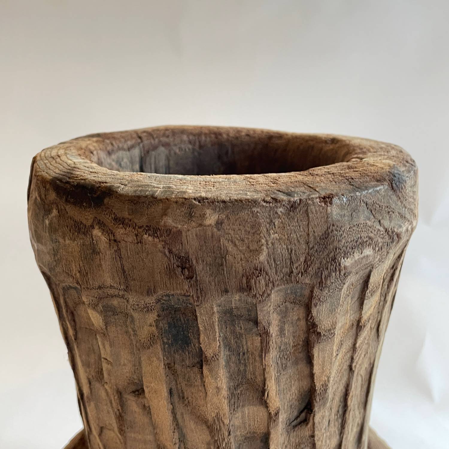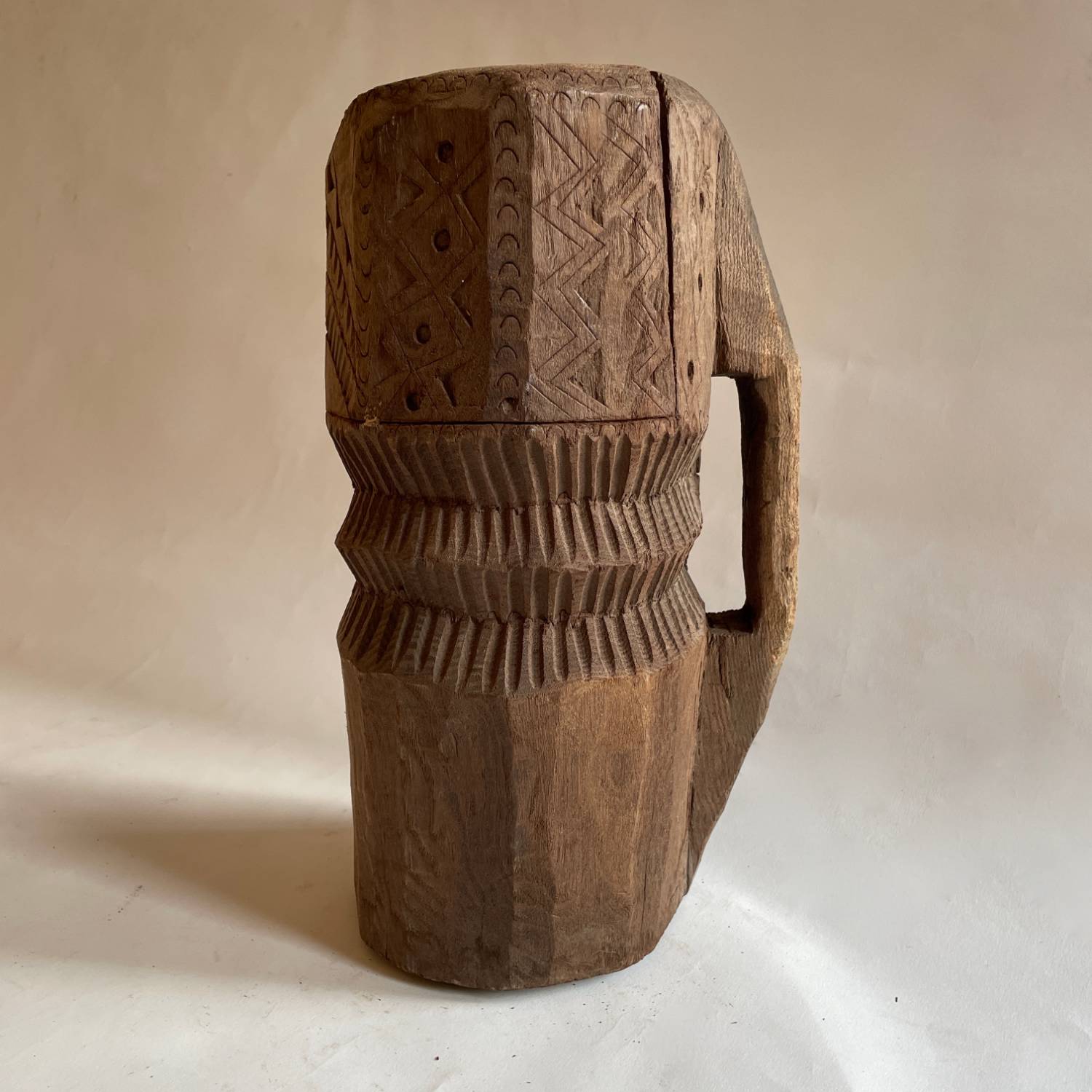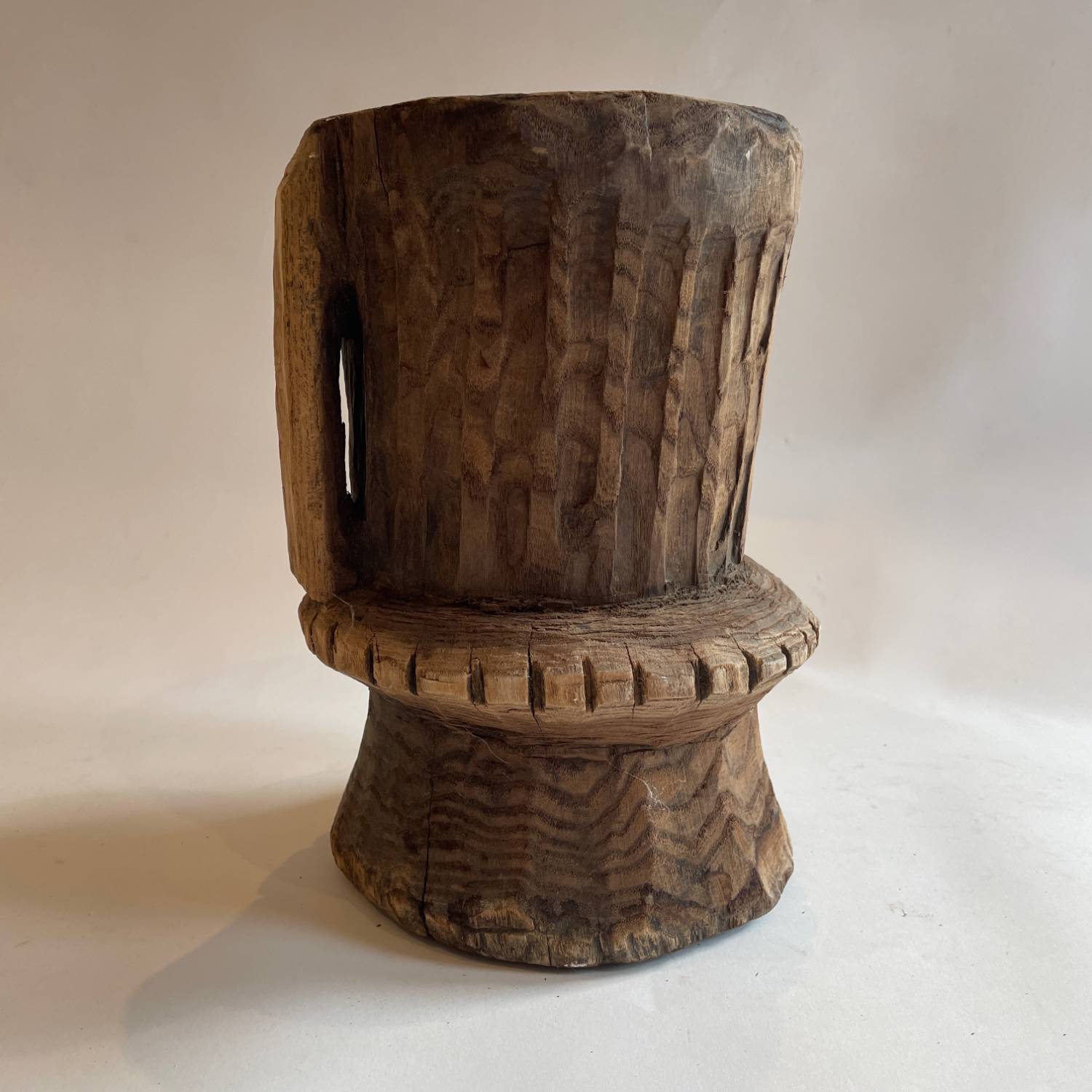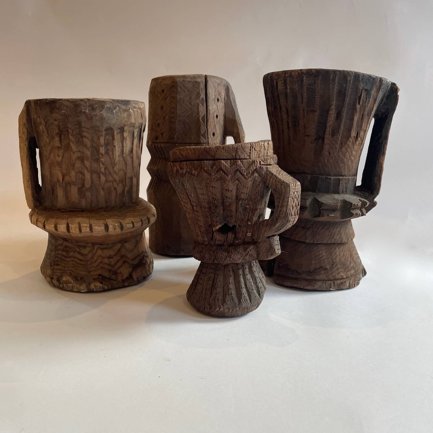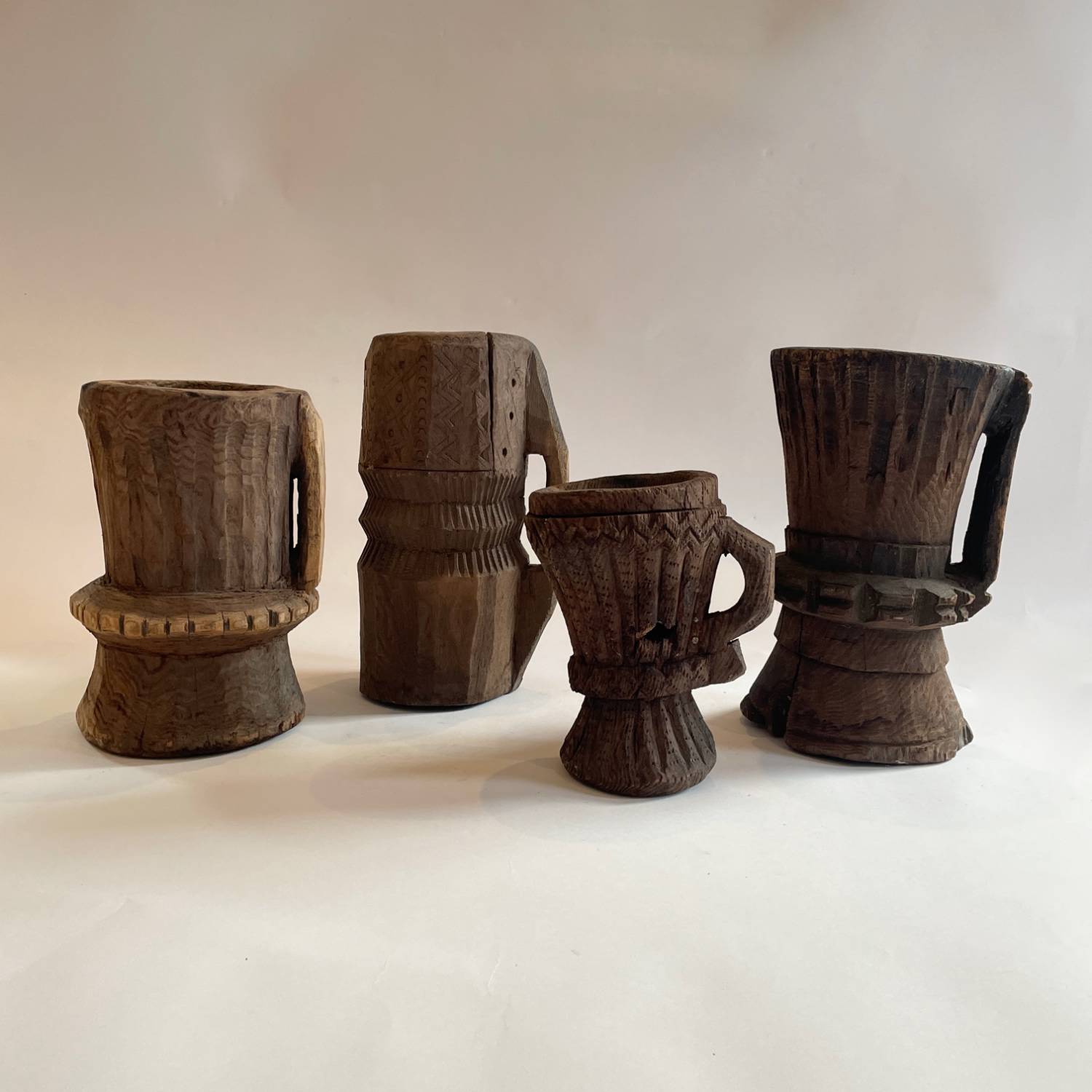 A set of 4 late 18th century Afghan hand carved wooden mortars from the Nuristan region. They have a waisted design with a carrying handle & decorative carved girdles.