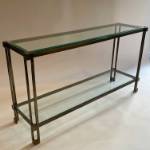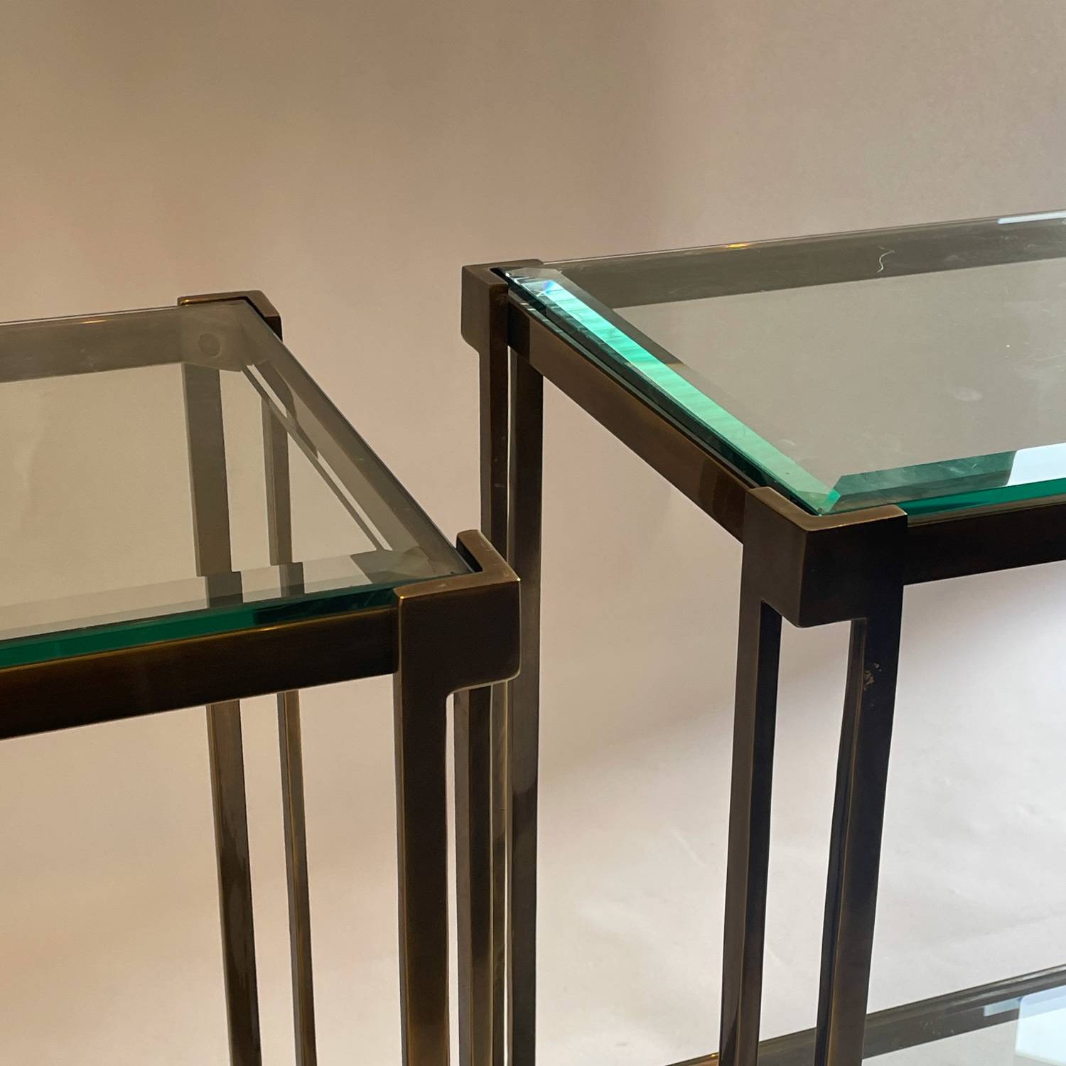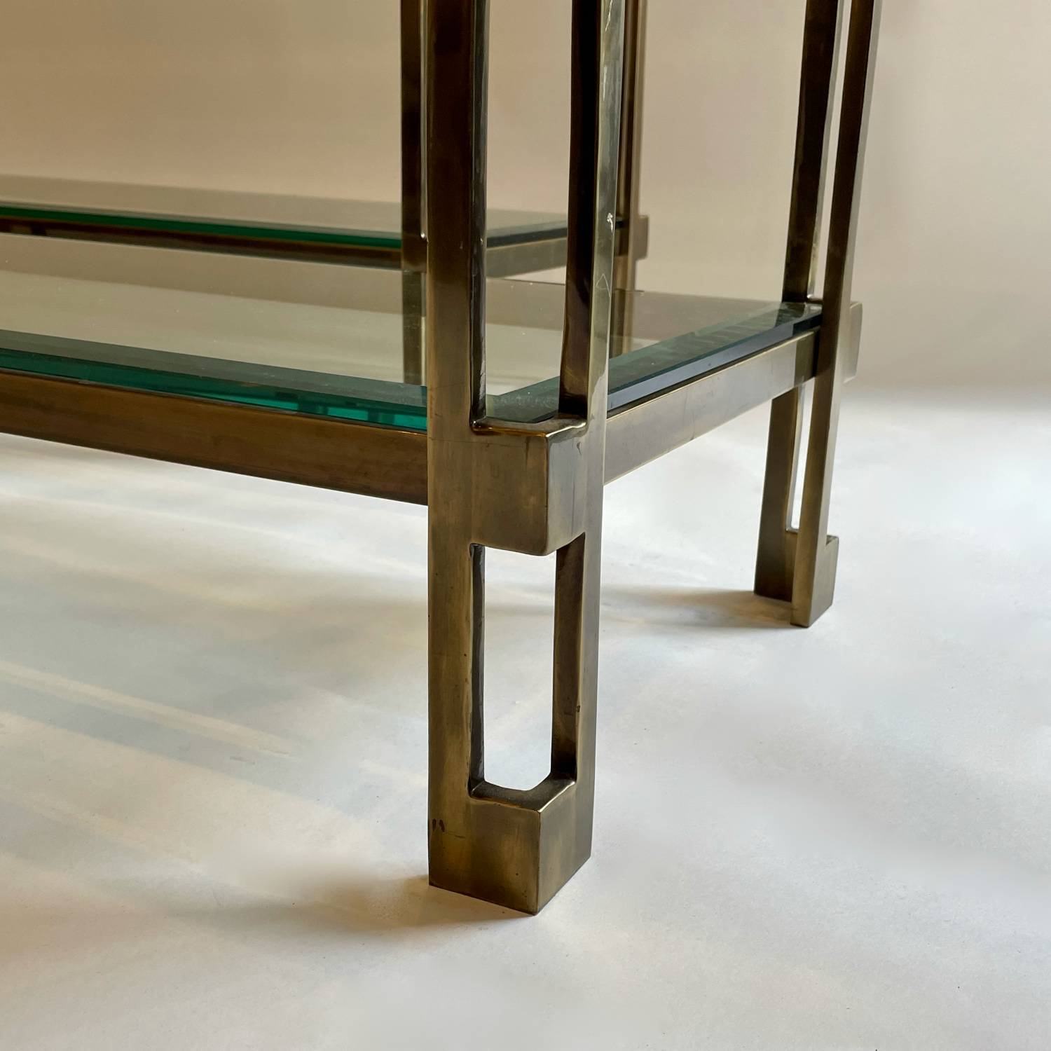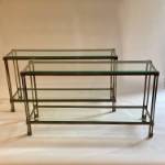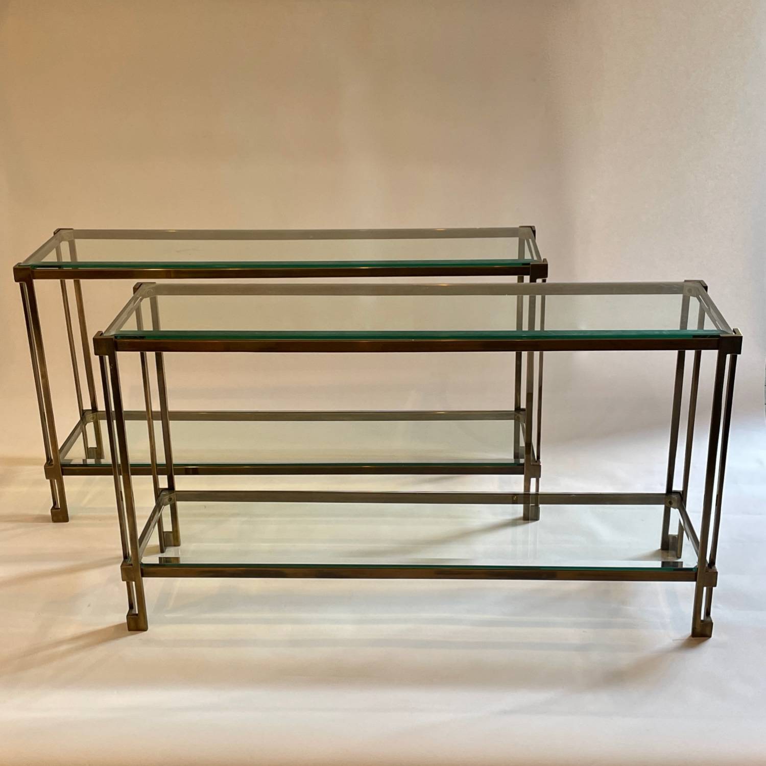 A chic pair of patinated brass, 2 tiered console tables with bevelled glass shelves. Small chip on one of the shelves but barely noticeable.